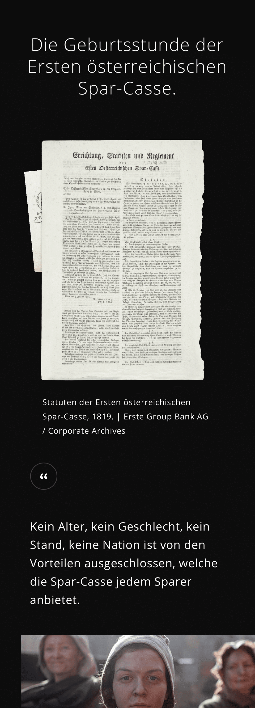 Im TV-Spot wird die Geschichte der ersten Kundin erzählt, die eine Vision der Zukunft erlebt und in der von WILD und papabogner konzipierten Website wird die Geschichte der Bank mit der Geschichte unseres Landes — und in weiterer Folge ganz Europas — verknüpft.